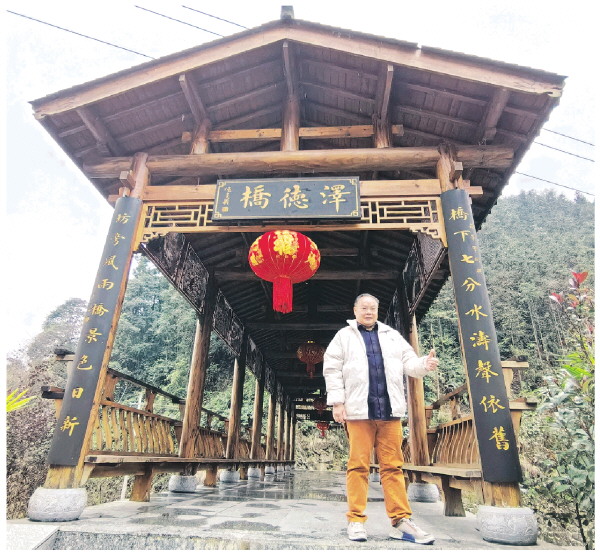 2月26日,唐泽德站在村口的泽德桥前留影。记者秦丽云 摄