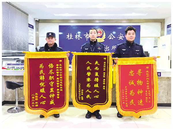 2月9日,广州游客刘先生在我市游览日月双塔时,不慎丢失了一台价值14000元的运动相机。接到求助后,白龙派出所迅速启动网格联动机制,民警与网格员协同作战。网格员利用对辖区地形的熟悉迅速锁定可能的遗失区域,民警则通过调取监控和走访调查,仅用两小时便在景区附近找到了相机。刘先生激动地说:“没想到这么快就找回来了,桂林警察真是神速!”数日后,刘先生将一面“失而复得暖人心 人民警察为人民”的锦旗从广州邮寄至白龙派出所表示感谢。