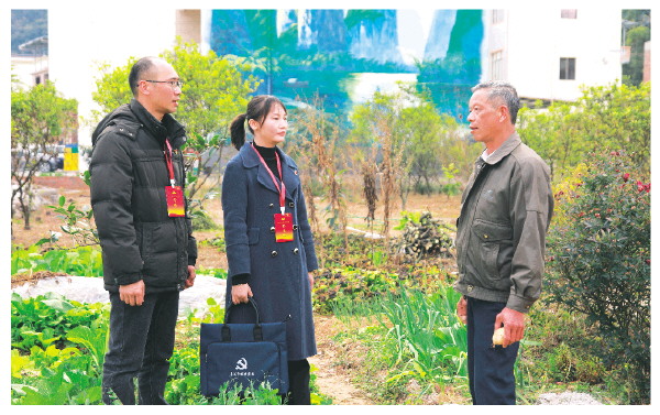 荔浦市纪委监委聚焦群众关切,坚持从“小切口”入手,围绕农村集体“三资”管理、惠农政策落实、涉农补贴发放,深入基层一线开展监督检查,严惩群众身边的“蝇贪蚁腐”。图为该市纪检监察干部在青山镇大腊村走访群众,收集问题线索。 周子幸 摄