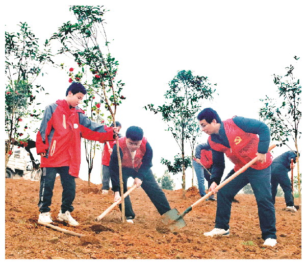 ▲近日,临桂两江镇组织党员、驻村工作队、两江初中师生一行30余人到高妙村空港花田种植山茶花、桂花等绿植。师生们三五人一组,挥锹铲土,大手牵小手,为花田添“绿”。 记者刘菁 通讯员胡艺 摄