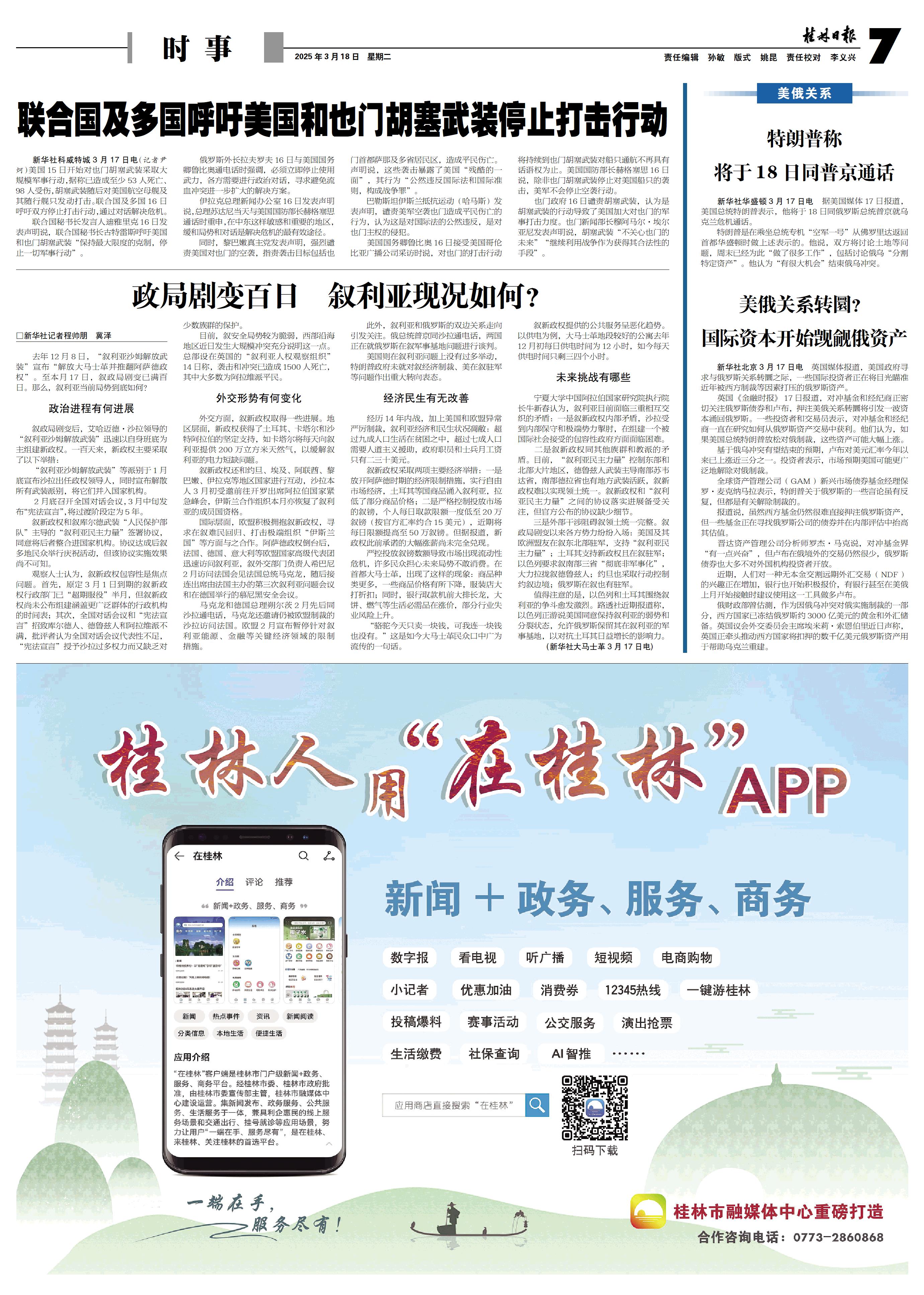 □新华社记者程帅朋 冀泽 去年12月8日,“叙利亚沙姆解放武装”宣布“解放大马士革并推翻阿萨德政权”。至本月17日,叙政局剧变已满百日。那么,叙利亚当前局势到底如何? 政治进程有何进展 叙政局剧变后,艾哈迈德·沙拉领导的“叙利亚沙姆解放武装”迅速以自身班底为主组建新政权。一百天来,新政权主要采取了以下举措: “叙利亚沙姆解放武装”等派别于1月底宣布沙拉出任政权领导人,同时宣布解散所有武装派别,将它们并入国家机构。 2月底召开全国对话会议,3月中旬发布“宪法宣言”,将过渡阶段定为5年。 叙新政权和叙库尔德武装“人民保护部队”主导的“叙利亚民主力量”签署协议,同意将后者整合进国家机构。协议达成后叙多地民众举行庆祝活动,但该协议实施效果尚不可知。 观察人士认为,叙新政权包容性是焦点问题。首先,原定3月1日到期的叙新政权行政部门已“超期服役”半月,但叙新政权尚未公布组建涵盖更广泛群体的行政机构的时间表;其次,全国对话会议和“宪法宣言”招致库尔德人、德鲁兹人和阿拉维派不满,批评者认为全国对话会议代表性不足,“宪法宣言”授予沙拉过多权力而又缺乏对少数族群的保护。 目前,叙安全局势较为脆弱,西部沿海地区近日发生大规模冲突充分说明这一点。总部设在英国的“叙利亚人权观察组织”14日称,袭击和冲突已造成1500人死亡,其中大多数为阿拉维派平民。 外交形势有何变化 外交方面,叙新政权取得一些进展。地区层面,新政权获得了土耳其、卡塔尔和沙特阿拉伯的坚定支持,如卡塔尔将每天向叙利亚提供200万立方米天然气,以缓解叙利亚的电力短缺问题。 叙新政权还和约旦、埃及、阿联酋、黎巴嫩、伊拉克等地区国家进行互动,沙拉本人3月初受邀前往开罗出席阿拉伯国家紧急峰会,伊斯兰合作组织本月亦恢复了叙利亚的成员国资格。 国际层面,欧盟积极拥抱叙新政权,寻求在叙难民回归、打击极端组织“伊斯兰国”等方面与之合作。阿萨德政权倒台后,法国、德国、意大利等欧盟国家高级代表团迅速访问叙利亚,叙外交部门负责人希巴尼2月访问法国会见法国总统马克龙,随后接连出席由法国主办的第三次叙利亚问题会议和在德国举行的慕尼黑安全会议。 马克龙和德国总理朔尔茨2月先后同沙拉通电话,马克龙还邀请仍被欧盟制裁的沙拉访问法国。欧盟2月宣布暂停针对叙利亚能源、金融等关键经济领域的限制措施。 此外,叙利亚和俄罗斯的双边关系走向引发关注。俄总统普京同沙拉通电话,两国正在就俄罗斯在叙军事基地问题进行谈判。 美国则在叙利亚问题上没有过多举动,特朗普政府未就对叙经济制裁、美在叙驻军等问题作出重大转向表态。 经济民生有无改善 经历14年内战,加上美国和欧盟异常严厉制裁,叙利亚经济和民生状况凋敝:超过九成人口生活在贫困之中,超过七成人口需要人道主义援助,政府职员和士兵月工资只有二三十美元。 叙新政权采取两项主要经济举措:一是放开阿萨德时期的经济限制措施,实行自由市场经济,土耳其等国商品涌入叙利亚,拉低了部分商品价格;二是严格控制投放市场的叙镑,个人每日取款限额一度低至20万叙镑(按官方汇率约合15美元),近期将每日限额提高至50万叙镑。但据报道,新政权此前承诺的大幅涨薪尚未完全兑现。 严控投放叙镑数额导致市场出现流动性危机,许多民众担心未来局势不敢消费。在首都大马士革,出现了这样的现象:商品种类更多,一些商品价格有所下降,服装店大打折扣;同时,银行取款机前大排长龙,大饼、燃气等生活必需品在涨价,部分行业失业风险上升。 “骆驼今天只卖一块钱,可我连一块钱也没有。”这是如今大马士革民众口中广为流传的一句话。 叙新政权提供的公共服务呈恶化趋势。以供电为例,大马士革地段较好的公寓去年12月初每日供电时间为12小时,如今每天供电时间只剩三四个小时。 未来挑战有哪些 宁夏大学中国阿拉伯国家研究院执行院长牛新春认为,叙利亚目前面临三重相互交织的矛盾:一是叙新政权内部矛盾,沙拉受到内部保守和极端势力掣肘,在组建一个被国际社会接受的包容性政府方面面临困难。 二是叙新政权同其他族群和教派的矛盾。目前,“叙利亚民主力量”控制东部和北部大片地区,德鲁兹人武装主导南部苏韦达省,南部德拉省也有地方武装活跃,叙新政权难以实现领土统一。叙新政权和“叙利亚民主力量”之间的协议落实进展备受关注,但官方公布的协议缺少细节。 三是外部干涉阻碍叙领土统一完整。叙政局剧变以来各方势力纷纷入场:美国及其欧洲盟友在叙东北部驻军,支持“叙利亚民主力量”;土耳其支持新政权且在叙驻军;以色列要求叙南部三省“彻底非军事化”,大力拉拢叙德鲁兹人;约旦也采取行动控制约叙边境;俄罗斯在叙也有驻军。 值得注意的是,以色列和土耳其围绕叙利亚的争斗愈发激烈。路透社近期报道称,以色列正游说美国同意保持叙利亚的弱势和分裂状态,允许俄罗斯保留其在叙利亚的军事基地,以对抗土耳其日益增长的影响力。 (新华社大马士革3月17日电)