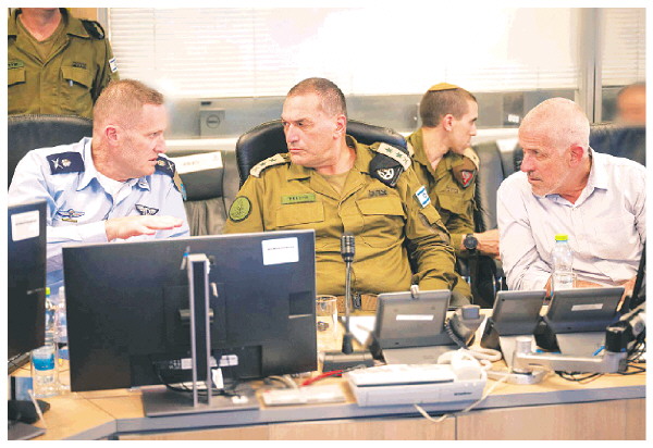 3月18日,以色列国防军总参谋长扎米尔(前中)和以国家安全总局(辛贝特)局长巴尔(前右)在以色列空军地下作战中心指挥对加沙地带的空袭。