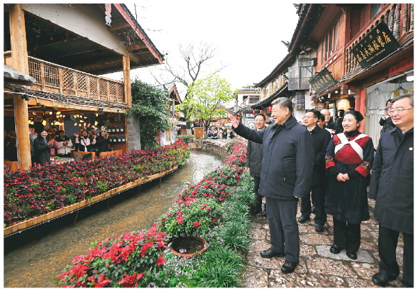 丽江古城有800多年历史,被列入世界文化遗产名录。一场春雪过后,丽江游人如织。习近平来到这里,详细了解古城营建历史、纳西族民居特色和当地文化遗产保护利用、推动文旅融合发展等情况。居民和游客见到总书记十分兴奋,争相问好,有的还弹奏乐器、载歌载舞欢迎总书记。习近平频频与大家互动交流,了解商铺经营状况和游客感受。他要求当地处理好保护和发展的关系,让这座美丽的古城焕发新的光彩。