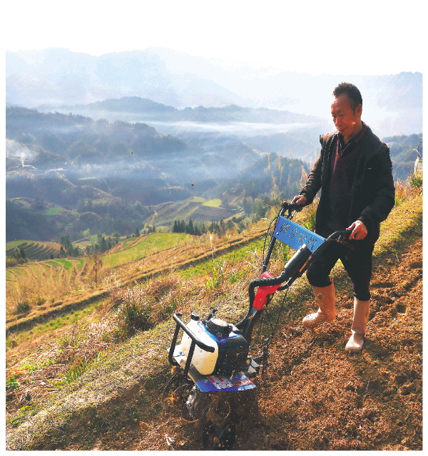 ▲为做好今年的春耕生产,农行广西桂林分行发放惠农e贷、商户e贷、商户贷等贷款约3亿元,支持农民购买农药化肥、饲料、小农机、农具、种子等,全面拉开春耕序幕。图为广西龙胜各族自治县龙脊镇金坑梯田村民潘先生在耕田。 (伍文悄 摄)
