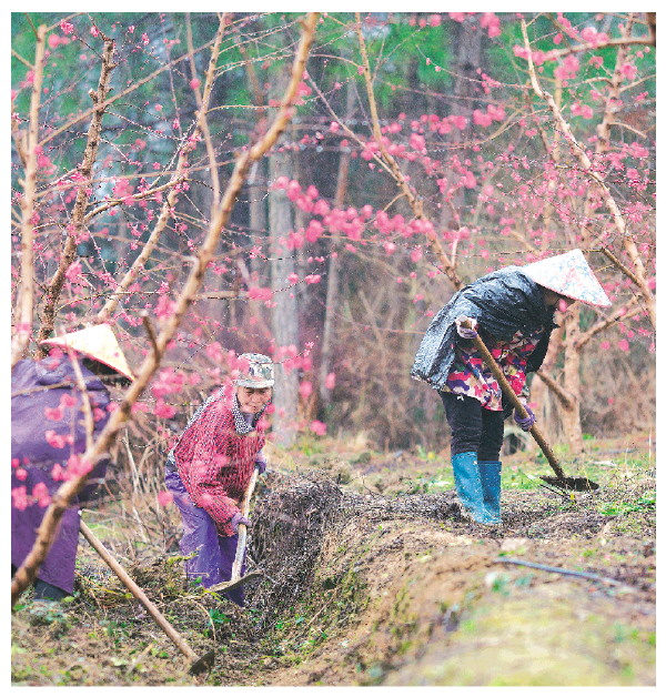尽管春雨绵绵,在桃园深处,种植户与管护工人早已忙碌起来。他们趁着花期积极开展春耕春管工作,精心呵护桃树,满心期待着新一年的丰收。