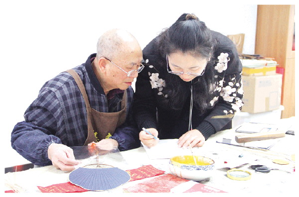 黄可人与父亲探讨团扇扇面图案。 记者黄敏 摄