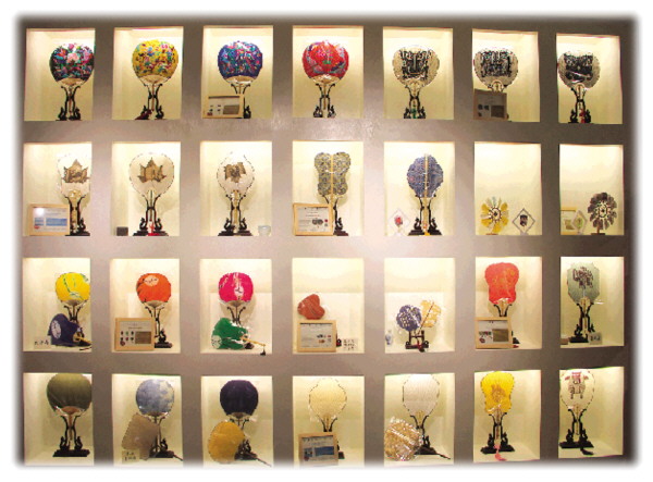 黄可人设计的团扇先后获得9项联合国教科文组织、世界手工艺理事会颁发的“杰出手工艺品徽章认证”。图为部分展示品。 记者黄敏 摄