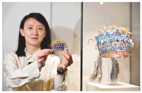 3月25日,一名记者在北京中国国家博物馆展出的明孝端皇后九龙九凤冠旁展示凤冠冰箱贴。