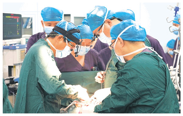 周新民主任(左)主刀首台“人工主动脉瓣置换”手术
