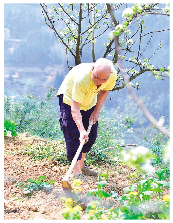 与此同时,田间地头的农事活动如火如荼展开。村民兰基干正在地里除草、松土、施肥,为新一年丰收忙碌。兰基干种植梨树已有30余年,起初只种苹果梨,随着市场需求的变化,如今他的果园已有黄金梨、丰水梨等多个品种。他介绍,自己的梨从农历五月一直卖到八月,销售旺季每天能卖出1000多斤,年收入可达10万元左右。