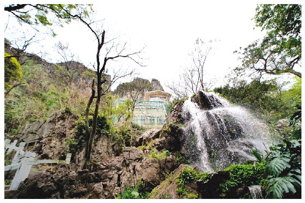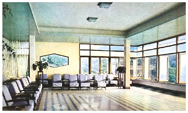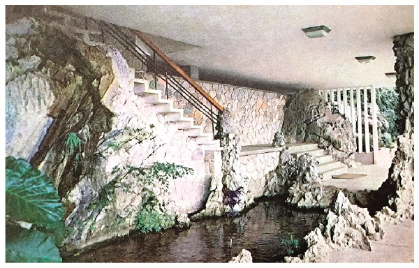 图④:早期楼内一层敞厅,保留了山体岩石,布置了人工水池,同自然景色浑然一体。 苏展 翻拍