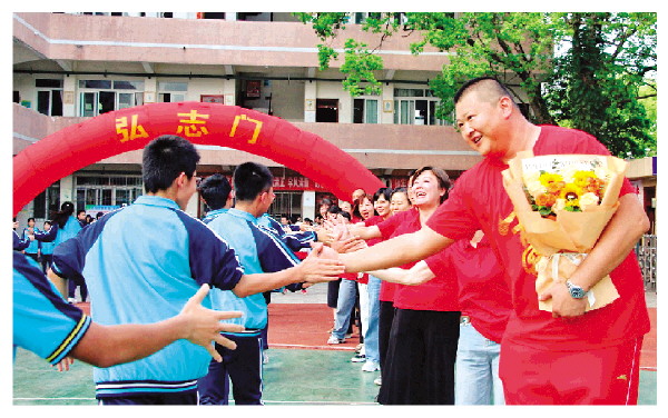 校领导、老师、奥运冠军和教练为初三学子击掌送祝福。(刘远辉 摄)