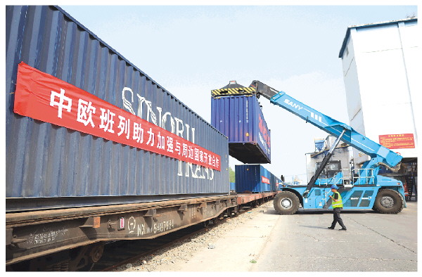 4月16日,在北京2025年首趟中欧班列(北京—莫斯科)发车前,起重机吊装集装箱。当日,一列满载空调、防水卷材、轮胎等货物的中欧班列从中国铁路北京局北京铁路物流中心琉璃河营业网点专用线缓缓驶出,驶向俄罗斯首都莫斯科,标志着今年首趟北京至莫斯科中欧班列顺利开行。据介绍,本次班列将从满洲里口岸出境,一路向西驶向莫斯科,全程约9000公里,预计运输时间16天。新华社记者张晨霖 摄