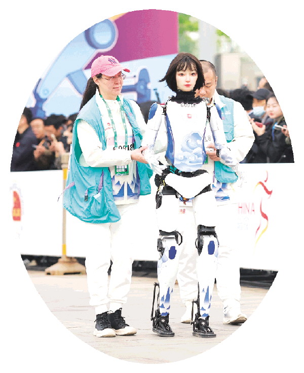 起跑线前,人类运动员举起手机,与机器人选手拍照;人形机器人轻挥手臂致意。一出发,欢呼阵阵。