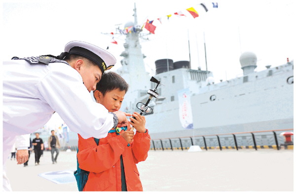 当日,在人民海军成立76周年之际,驻沪海军部队联合上海市双拥办共同组织以“上海·海上”为主题的舰艇开放活动。两艘海军现役主战舰艇综合登陆舰沂蒙山舰和导弹驱逐舰西安舰靠泊上海港国际客运中心码头,市民游客不仅能够登舰参观,还在现场观看和参与文艺表演和国防教育科普活动。
