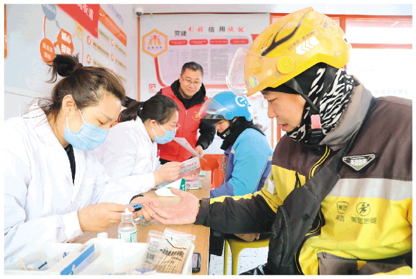 ◤2025年3月5日,志愿者在山东省枣庄市市中区一工会驿站为外卖员免费测量血糖。
