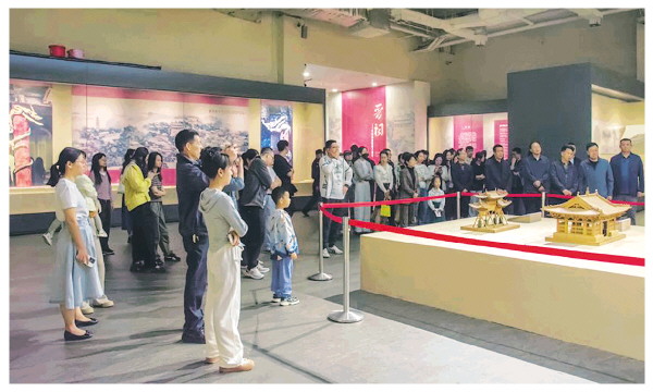 ◥观众在博物馆讲解员的带领下观看“晋祠——中国祠庙园林之典范”展览。
