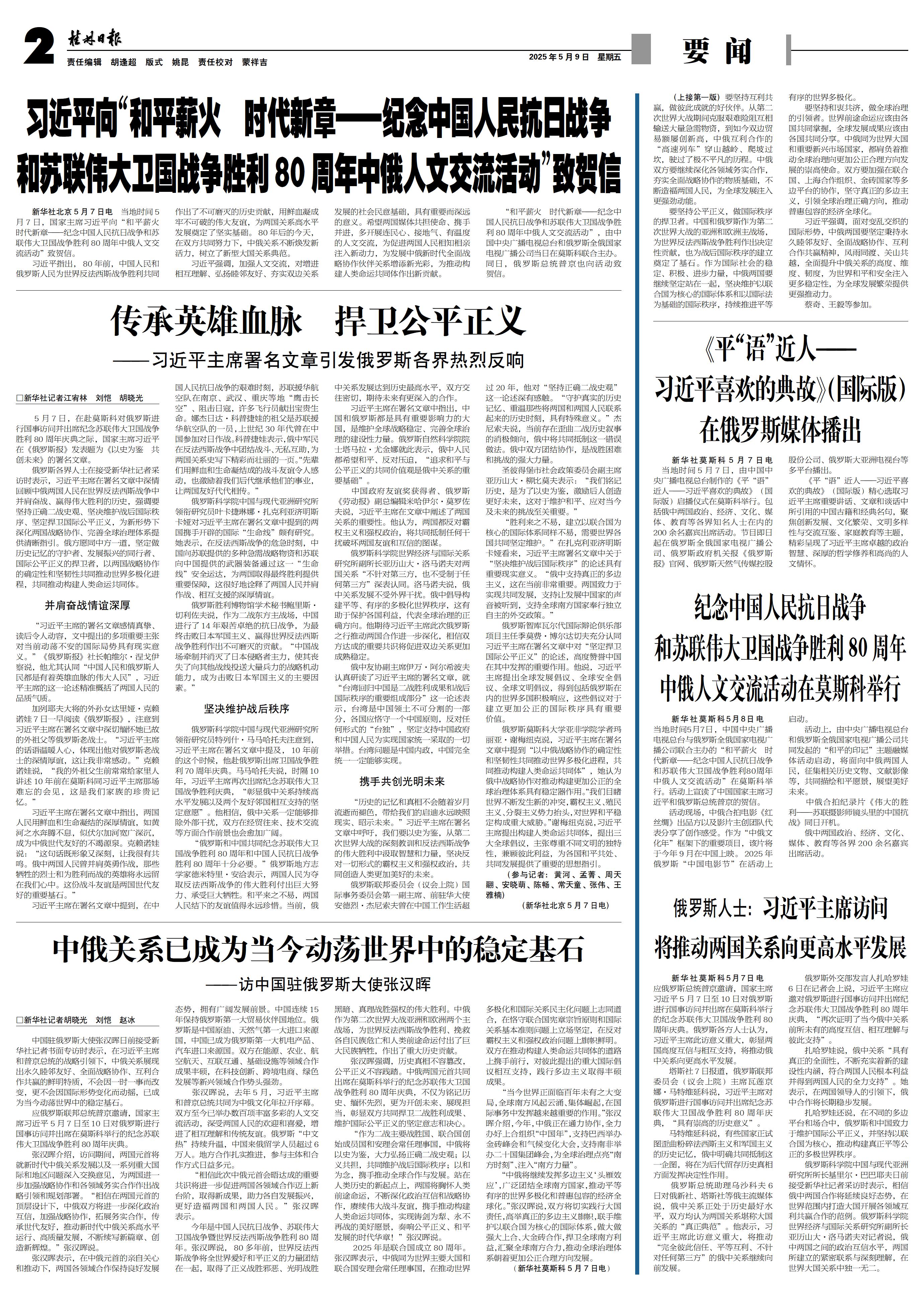 □新华社记者胡晓光 刘恺 赵冰 中国驻俄罗斯大使张汉晖日前接受新华社记者书面专访时表示,在习近平主席和普京总统的战略引领下,中俄关系展现出永久睦邻友好、全面战略协作、互利合作共赢的鲜明特质,不会因一时一事而改变,更不会因国际形势变化而动摇,已成为当今动荡世界中的稳定基石。 应俄罗斯联邦总统普京邀请,国家主席习近平5月7日至10日对俄罗斯进行国事访问并出席在莫斯科举行的纪念苏联伟大卫国战争胜利80周年庆典。 张汉晖介绍,访问期间,两国元首将就新时代中俄关系发展以及一系列重大国际和地区问题深入交换意见,为两国进一步加强战略协作和各领域务实合作作出战略引领和规划部署。“相信在两国元首的顶层设计下,中俄双方将进一步深化政治互信,加强战略协作,拓展务实合作,传承世代友好,推动新时代中俄关系高水平运行、高质量发展,不断续写新篇章、创造新辉煌。”张汉晖说。 张汉晖表示,在中俄元首的亲自关心和推动下,两国各领域合作保持良好发展态势,拥有广阔发展前景。中国连续15年保持俄罗斯第一大贸易伙伴国地位。俄罗斯是中国原油、天然气第一大进口来源国,中国已成为俄罗斯第一大机电产品、汽车进口来源国。双方在能源、农业、航空航天、互联互通、基础设施等领域合作成果丰硕,在科技创新、跨境电商、绿色发展等新兴领域合作势头强劲。 张汉晖说,去年5月,习近平主席和普京总统共同为中俄文化年拉开序幕。双方至今已举办数百项丰富多彩的人文交流活动,深受两国人民的欢迎和喜爱,增进了相互理解和传统友谊。俄罗斯“中文热”持续升温,中国来俄留学人员超过6万人。地方合作扎实推进,参与主体和合作方式日益多元。 “相信此次中俄元首会晤达成的重要共识将进一步促进两国各领域合作迈上新台阶,取得新成果,助力各自发展振兴,更好造福两国和两国人民。”张汉晖表示。 今年是中国人民抗日战争、苏联伟大卫国战争暨世界反法西斯战争胜利80周年。张汉晖说,80多年前,世界反法西斯战争将全世界爱好和平正义的力量团结在一起,取得了正义战胜邪恶、光明战胜黑暗、真理战胜强权的伟大胜利。中俄作为第二次世界大战亚洲和欧洲两个主战场,为世界反法西斯战争胜利、挽救各自民族危亡和人类前途命运付出了巨大民族牺牲,作出了重大历史贡献。 张汉晖强调,历史真相不容篡改,公平正义不容践踏。中俄两国元首共同出席在莫斯科举行的纪念苏联伟大卫国战争胜利80周年庆典,不仅为铭记历史、缅怀先烈,更为开创未来、展现担当,彰显双方共同捍卫二战胜利成果、维护国际公平正义的坚定意志和决心。 “作为二战主要战胜国、联合国创始成员国和安理会常任理事国,中俄将以史为鉴,大力弘扬正确二战史观;以义共担,共同维护战后国际秩序;以和为念,携手推动全球合作与发展。站在人类历史的新起点上,两国将胸怀人类前途命运,不断深化政治互信和战略协作,赓续伟大战斗友谊,携手推动构建人类命运共同体,实现铸剑为犁、永不再战的美好愿景,奏响公平正义、和平发展的时代华章!”张汉晖说。 2025年是联合国成立80周年。张汉晖表示,中俄同为世界主要大国和联合国安理会常任理事国,在推动世界多极化和国际关系民主化问题上志同道合,在恪守联合国宪章宗旨原则和国际关系基本准则问题上立场坚定,在反对霸权主义和强权政治问题上旗帜鲜明。双方在推动构建人类命运共同体的道路上携手前行,对彼此提出的重大国际倡议相互支持,践行多边主义取得丰硕成果。 “当今世界正面临百年未有之大变局,全球南方风起云涌、集体崛起,在国际事务中发挥越来越重要的作用。”张汉晖介绍,今年,中俄正在通力协作,全力办好上合组织“中国年”,支持巴西举办金砖峰会和气候变化大会,支持南非举办二十国集团峰会,为全球治理点亮“南方时刻”、注入“南方力量”。 “中俄将继续发挥多边主义‘头雁效应’,广泛团结全球南方国家,推动平等有序的世界多极化和普惠包容的经济全球化。”张汉晖说,双方将切实践行大国责任,高举真正的多边主义旗帜,联手维护以联合国为核心的国际体系,做大做强大上合、大金砖合作,捍卫全球南方利益,汇聚全球南方合力,推动全球治理体系朝着更加公正合理方向发展。 (新华社莫斯科5月7日电)