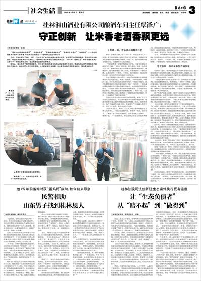 日前,记者来到位于湘江、灌江、万乡河交汇地的桂林湘山酿酒生态园。走进园区内的酿酒车间,晨光穿透古朴的窗棂,轻洒在排列整齐的小坛地缸上。桂林湘山酒业有限公司酿酒车间主任、2024年“桂林工匠”称号获得者覃泽广正穿行于一排排发酵坛之间,专注地查看酒醅的发酵情况。