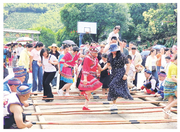 5月5日活动现场,各族群众体验跳竹竿舞。王道梅 摄