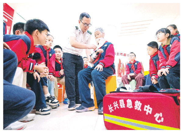 5月8日,浙江省湖州市长兴县急救中心红十字工作者在长兴县第二实验小学为学生演示创伤救护。