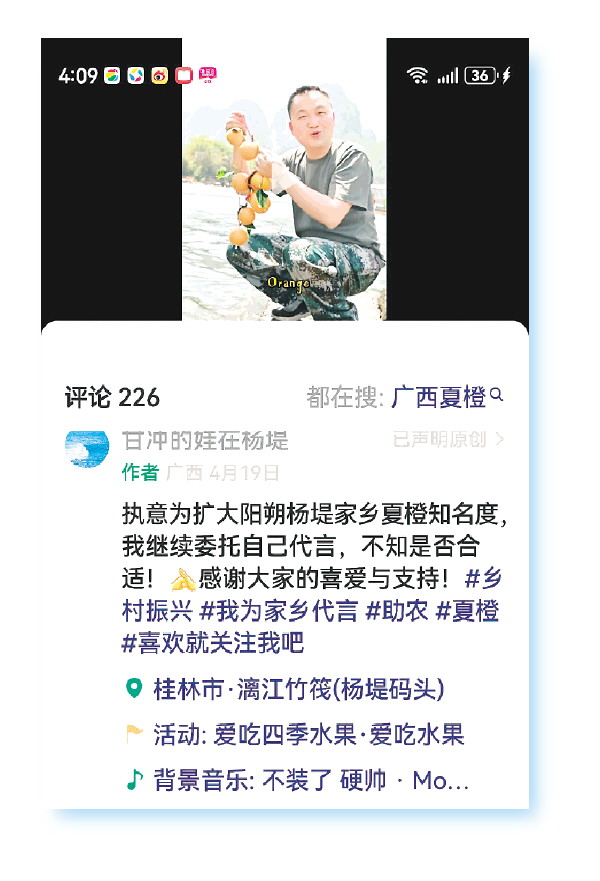 阳朔县杨堤乡政府干部为家乡代言,在短视频中推介当地特产夏橙。 (视频截图)
