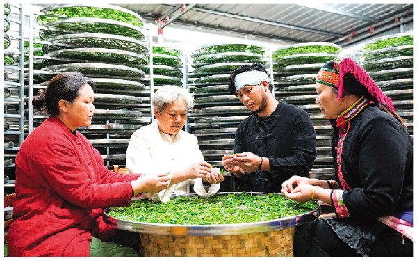 陈扬芳、陈峰、马玉成、刘莉芳等三代制茶人在一起挑拣茶叶,六峒茶有望在新时代再续辉煌。