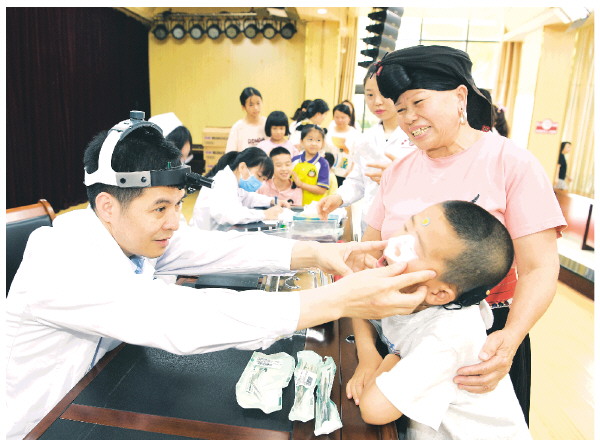 5月14日,桂林市聋哑学校内,一名来自龙胜金坑大寨的听障儿童接受市人民医院的义诊。当天,桂林市聋哑学校与桂林市人民医院举行了医教康融合发展基地揭牌仪式;人民医院还为学校的孩子们提供视力检查、听力筛查、语言康复等义诊服务。