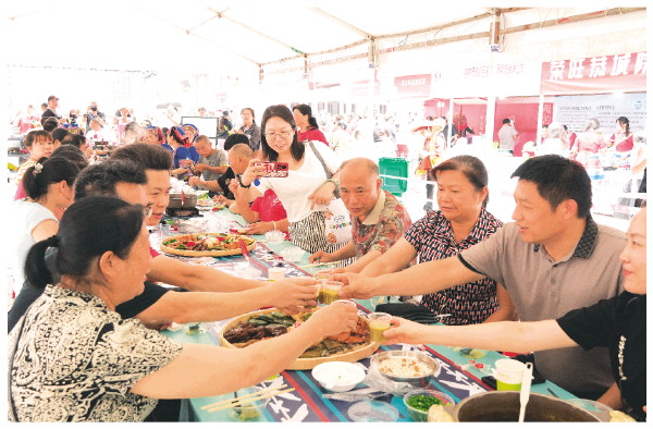 ▲油茶长桌宴上,游客举杯欢庆。 记者何月 摄