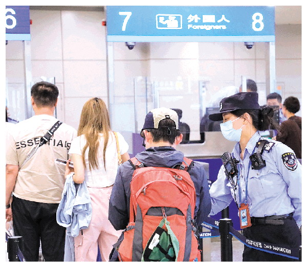 ▲2025年5月3日,无锡边检站工作人员在无锡硕放机场边检入境现场引导外籍游客。