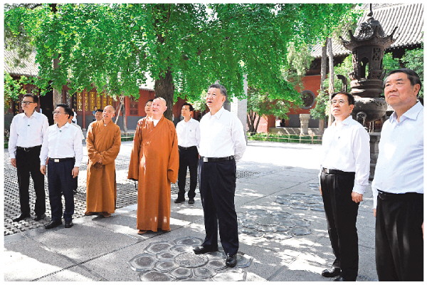 随后,习近平来到始建于东汉年间的白马寺考察,详细了解佛教中国化和寺院文物保护情况。他指出,白马寺见证了佛教传入、发展并不断中国化的进程。历史证明,坚持我国宗教中国化方向是完全正确的,要积极引导宗教同中华优秀传统文化相融合、与社会主义社会相适应。