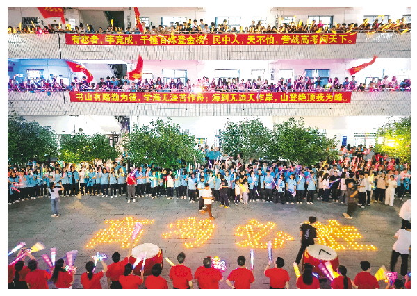 高考临近,我市各高中学校积极组织各种活动帮助高三学生释放备考压力调节情绪。5月15日晚,平乐县民族中学举行2025年高考“喊楼”活动,全校2000余名师生通过同唱励志歌曲,低年级学生摇旗互动呐喊送祝福语等形式给高考学子减压,鼓励他们以最佳心态迎接高考。苏桂 摄