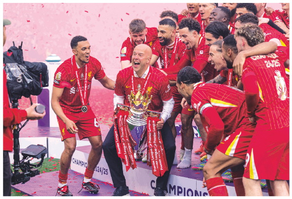 当日,在2024-2025赛季英格兰足球超级联赛最后一轮比赛中,已提前夺冠的利物浦队主场1比1战平水晶宫队。赛后举行了颁奖仪式,庆祝利物浦队夺得本赛季英超冠军。