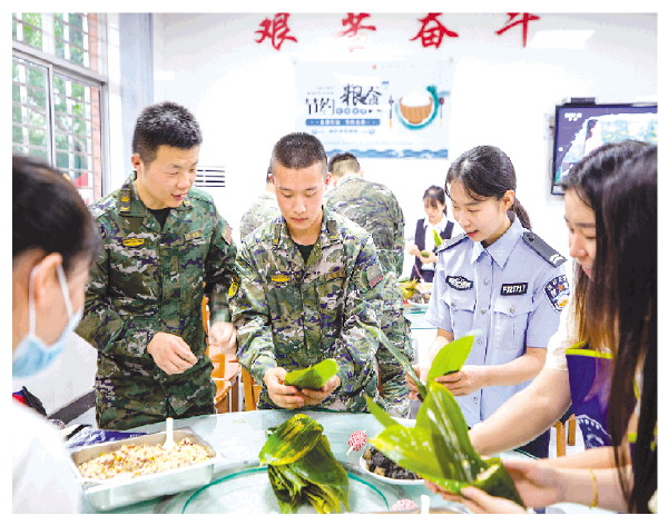 武警官兵与友邻单位代表一起包粽子迎端午。 农文尖 摄