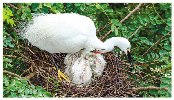 ▼白鹭妈妈在巢穴照顾新生的幼鸟。
