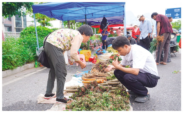 ▲逛药市的人们正在草药摊前挑选草药。 吴靖 摄
