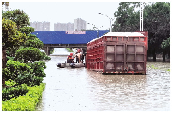 ▲灵川县东环路与八里九路交叉口一货车涉水被困,消防人员紧急救援司机脱险。 蒋创 摄
