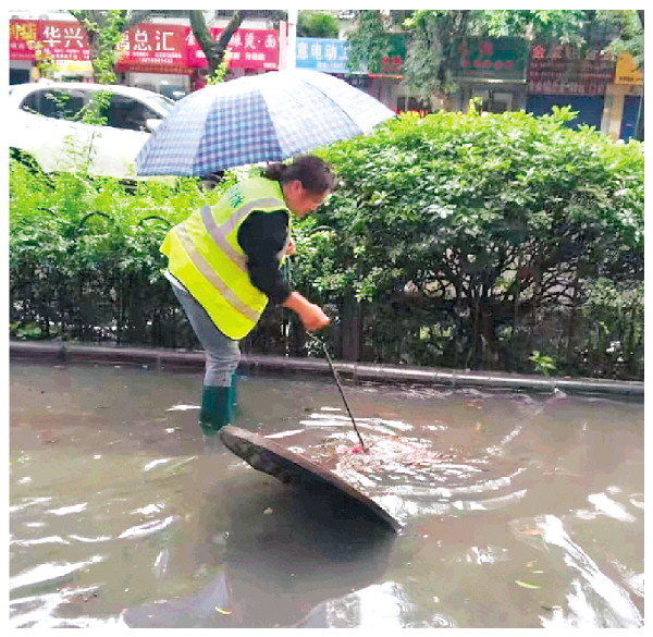 ▲市排水处工作人员在环城西二路开展消水排涝工作。