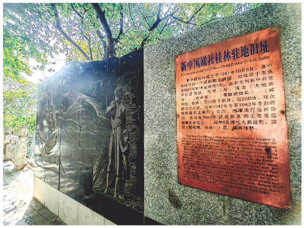 桂林市区的临江路位于漓江东岸,与伏波山、叠彩山隔江相望。在这条路中段的临江一侧,一面富有艺术设计感的纪念墙静静矗立,上面“新中国剧社桂林驻地旧址”几个金底蓝字十分醒目。碑文上记载:“新中国剧社成立于1941年10月5日,是中共领导的一个民间职业剧团。……由李文钊和中共党员杜宣创建。”
