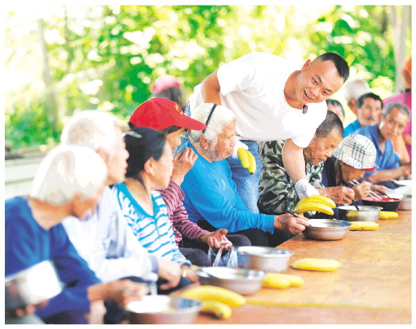 廖永辉给老人们分发香蕉。