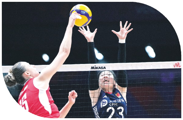 6月5日,中国队球员张籽萱(右)在比赛中拦网。