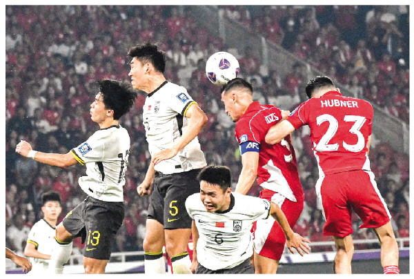 ▲6月5日,中国队球员朱辰杰(左二)与印度尼西亚队球员伊泽斯(右二)在比赛中争顶。 新华社发(阿贡·昆卡亚 摄)