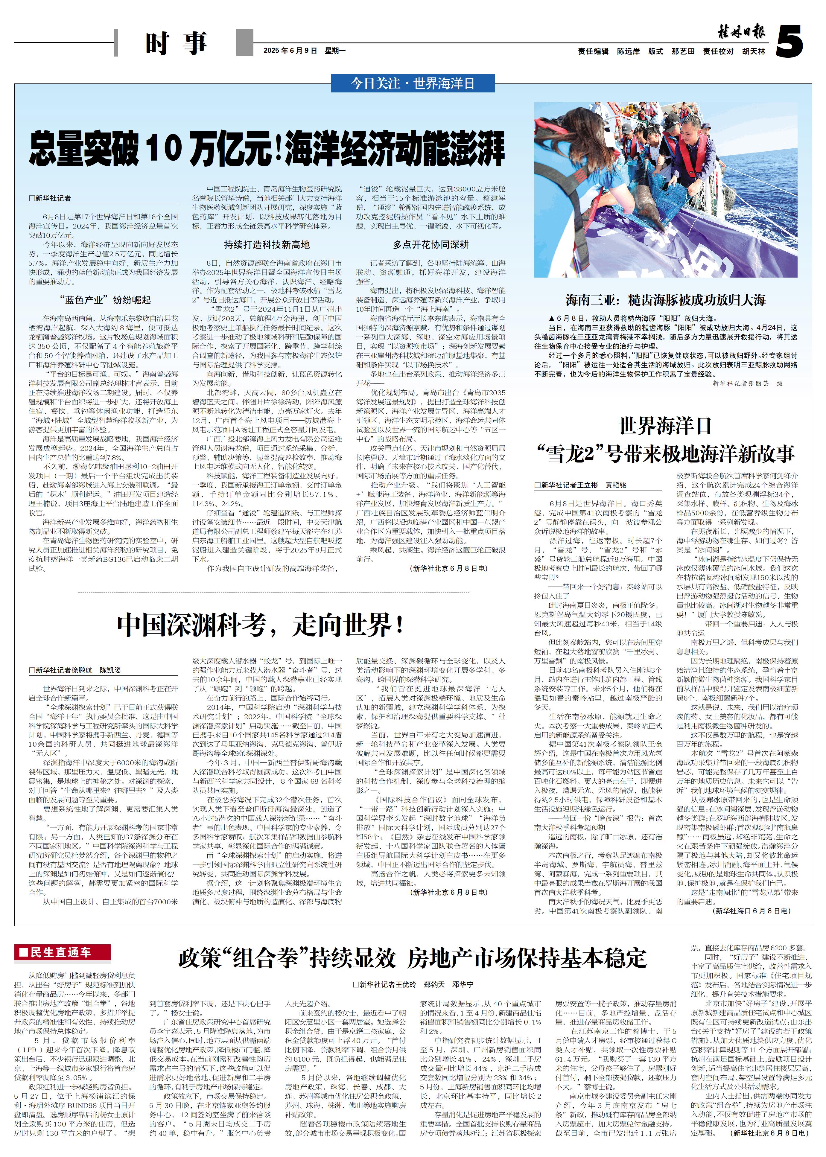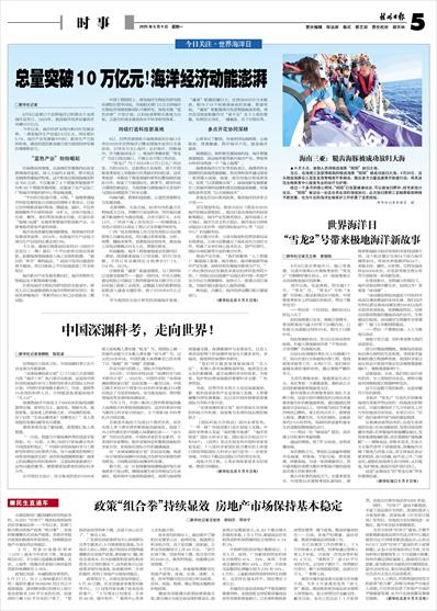 持续打造科技新高地 8日,自然资源部联合海南省政府在海口市举办2025年世界海洋日暨全国海洋宣传日主场活动,引导各方关心海洋、认识海洋、经略海洋。作为配套活动之一,极地科考破冰船“雪龙2”号近日抵达海口,开展公众开放日等活动。 “雪龙2”号于2024年11月1日从广州出发,历时208天,总航程4万余海里,创下中国极地考察史上单船执行任务最长时间纪录。这次考察进一步推动了极地领域科研和后勤保障的国际合作,探索了开展国际化、跨季节、跨学科综合调查的新途径,为我国参与南极海洋生态保护与国际治理提供了科学支撑。 向海向新,借助科技创新,让蓝色资源转化为发展动能。 北部湾畔,天高云阔,80多台风机矗立在碧海蓝天之间。伴随叶片徐徐转动,阵阵海风源源不断地转化为清洁电能,点亮万家灯火。去年12月,广西首个海上风电项目——防城港海上风电示范项目A场址工程正式全容量并网发电。 广西广投北部湾海上风力发电有限公司运维管理人员谢海龙说,项目通过系统采集、分析、预警、辅助决策等,显著提高巡检效率,推动海上风电运维模式向无人化、智能化转变。 科技赋能,海洋工程装备制造业发展向好。一季度,我国新承接海工订单金额、交付订单金额、手持订单金额同比分别增长57.1%、114.3%、24.2%。 仔细查看“通浚”轮建造图纸、与工程师探讨设备安装细节……最近一段时间,中交天津航道局有限公司副总工程师蔡建军每天都守在江苏启东海工船舶工业园里。这艘超大型自航耙吸挖泥船进入建造关键阶段,将于2025年8月正式下水。 作为我国自主设计研发的高端海洋装备,“通浚”轮载泥量巨大,达到38000立方米舱容,相当于15个标准游泳池的容量。蔡建军说,“通浚”轮配备国内先进智能疏浚系统,成功攻克挖泥船操作员“看不见”水下土质的难题,实现自主寻优、一键疏浚、水下可视化等。