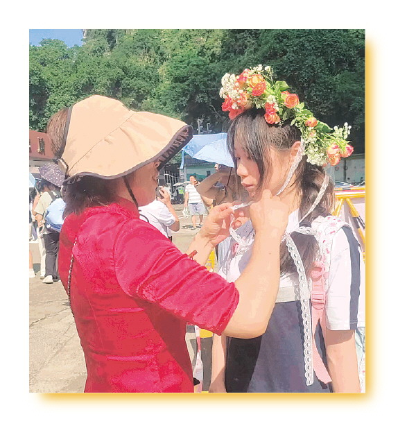 一位母亲为结束考试的女儿带上漂亮的花环。 记者张苑 摄