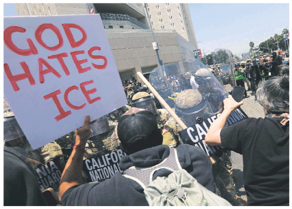 6月8日,在美国加利福尼亚州洛杉矶市中心的联邦执法机构门前,抗议者与国民警卫队人员对峙。 新华社发(邱晨摄)