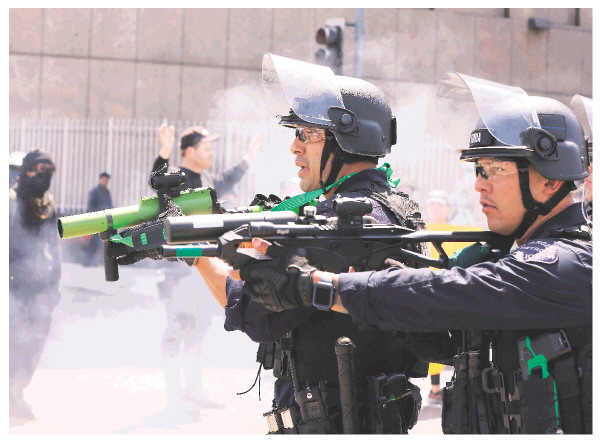 6月8日,在美国加利福尼亚州洛杉矶市中心的联邦执法机构门前,警察试图驱散抗议人群。 新华社发(邱晨摄)