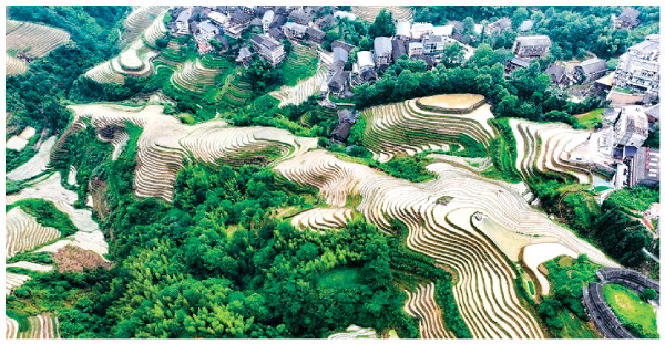 6月8日,龙胜各族自治县龙脊梯田层层叠叠,田埂蜿蜒,水平如镜,与青山、民居构成一幅美丽的生态画卷(无人机照片)。田文国 摄