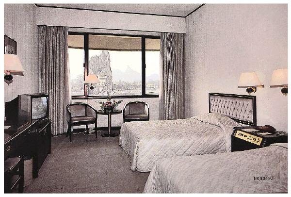 而事实也证明当时港资的介入确实在各个方面都让桂林住宿业有了一个质的提升。无论是酒店的装修还是选址,抑或是管理制度,还是人员培训都是按照与国际接轨的标准打造。就在1985年,由中国青年旅行社广西分社与香港中国贸易发展有限公司合资1500万美元兴建的帝苑酒店开始设计建设,选址位于漓江东畔临江路,与伏波山、叠彩山隔江相望,坐拥一线江景。历经两年,1987年5月30日试业,建筑面积3.17万平方米,楼高4层,局部8层,设有总统套间、贵宾套间、标准客房和各项设施。