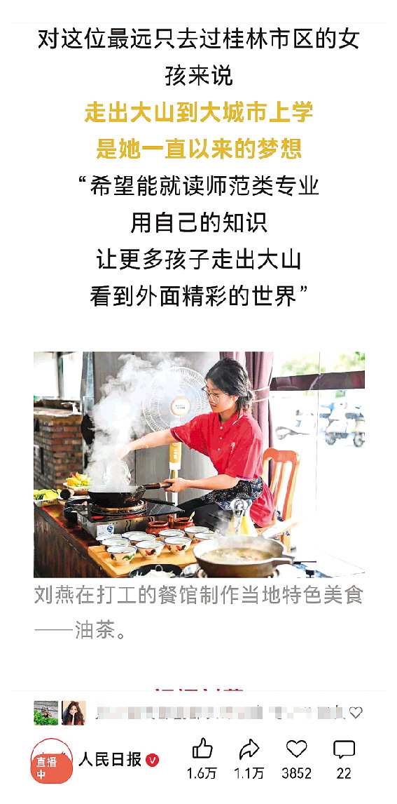 本报讯(记者秦丽云)6月13日,本报刊登了《灌阳一女孩高考结束后用扁担挑行李回家引全网共鸣 稀缺“扁担精神”映照时代担当》一文,讲述了灌阳一女孩高考结束后用扁担挑着行李回家的身影经过网络传播后,受到万千网友点赞和关注的事。14日,记者了解到,“扁担女孩”小刘同学已到灌阳县城的一家油茶餐馆打暑假工。 14日下午,记者综合多种渠道,了解到了更多关于“扁担女孩”小刘同学的信息。得知自己在网上“火了”,小刘同学感到很意外。因为在她看来,自己“就是日常搬运行李,没有什么特别的”。此外,自从高考回家后,小刘同学跟着妈妈一起下地干活,就是希望“妈妈不要那么辛苦”。 记者还了解到,小刘同学的父亲和哥哥常年在外打工,妈妈在家里务农。班主任陈老师在介绍小刘同学时,也夸她“上进懂事、心地善良”。陈老师还说,在小刘同学所在的灌阳县第二高级中学,大部分的学生来自农村,用编织袋装行李,用扁担挑行李,都是很常见的事。 从13日开始,小刘同学到灌阳县城的一家餐馆开启了打暑假工之旅,时薪为12元/小时,以此减轻家里的经济负担。这两天,她正学习制作当地特色美食——灌阳油茶、灌阳凉粉等,并学习使用收银机等工作。而在此前的数次采访中,小刘同学婉拒了各种资助。 记者注意到,小刘同学在接受新华社的采访时,谈及了高考。她说,高三生活这段奋斗的过程,“幸福有一点,但是也有点辛苦,过得也挺充实”。此外,她感觉自己高考“正常发挥,自己满意就好了”,并“希望攒钱,带父母和哥哥他们去外面看一下风景”,也希望“能就读师范类专业,用自己的知识,让更多孩子走出大山,看到外面精彩的世界”。 小刘同学找到暑假工的事,再次得到了人民日报微信公众号、新华社微信公众号的转发,阅读量均超“10万+”。对此,众多网友纷纷留言表示祝福。更多的网友则表示:希望不要再过多打扰这位朴实的农家女孩,并祝福她“带着大山的坚韧,去拥抱更大的世界”。 综合这几日的采访,记者得知,小刘同学一直对网友们的关注表示感谢,但是她也表达了想回归平静的生活的愿望。她说,她家并不富裕,但是很幸福,“爸爸妈妈都非常疼我,一家人在一起我就很满足”。