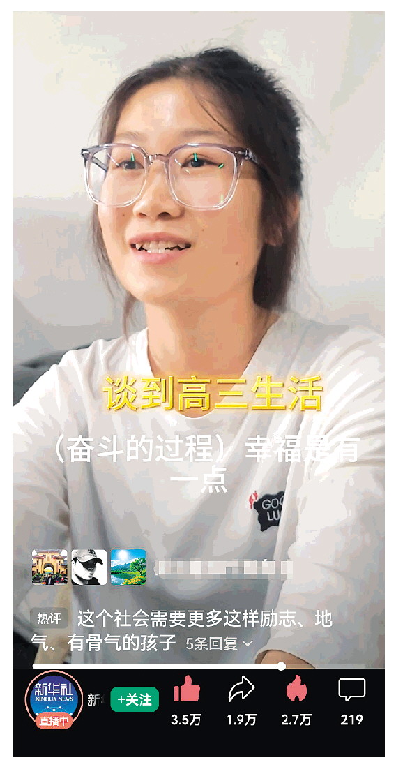 新华社微信公众号直播间采访了“扁担女孩”。(视频截图)